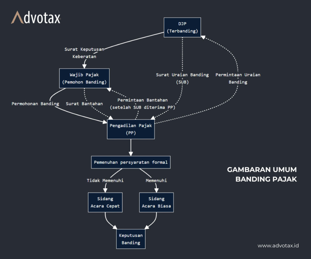 Pengajuan banding dilakukan ke Pengadilan Pajak dengan memenuhi persyaratan formal tertentu agar permohonan dapat diterima dan diperiksa. Di antaranya, banding harus diajukan dalam jangka waktu 3 bulan sejak tanggal diterimanya Surat Keputusan Keberatan, diajukan dalam Bahasa Indonesia, memuat uraian alasan banding secara jelas, serta dilampiri salinan Surat Keputusan Keberatan dan dokumen pendukung yang relevan. Selain itu, Wajib Pajak juga wajib melunasi pajak yang masih harus dibayar paling sedikit sebesar jumlah yang telah disetujui dalam pembahasan akhir hasil pemeriksaan sebelum keberatan diajukan.